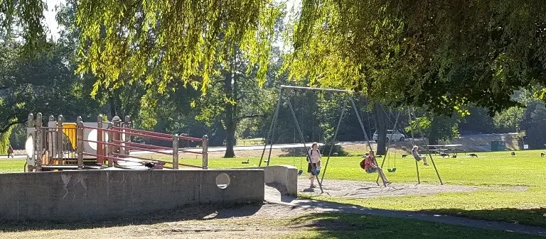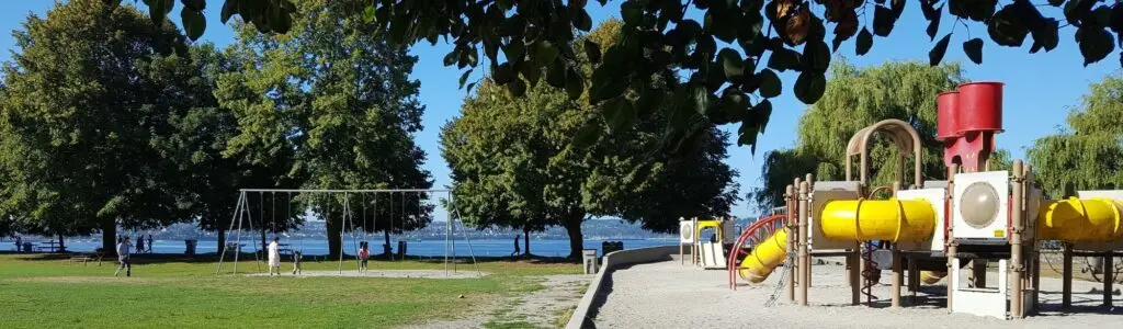 Prior to the reconstruction of this site for the Vancouver Parks Board, the field north of the beach had been a major depression, collecting water each winter and remaining unusable for much of the year. The contract involving hauling in several hundred truck loads of structural fill to create the gentle mound which exists today.